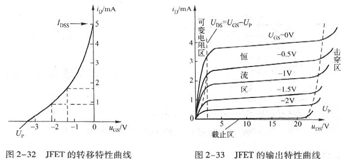 由此可見,結型MOS場效應管轉移特性曲線是用來闡明在一定的漏源電壓u陌時,柵源電壓UGS和漏極電流iD之間變化關系的曲線。JFET的轉移特性曲線如圖2-32所示。