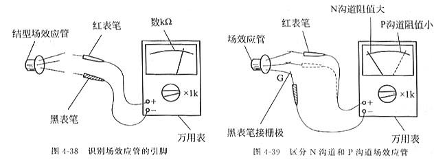 如圖4-39所示,將萬(wàn)(wàn)用表置于“RX1k”擋,黑表筆接?xùn)艠OG.紅表筆分別接另外兩引腳,假如測(cè)(cè)得兩個(gè)(gè)電阻值均很大,則為N溝道場(chǎng)(chǎng)效應(yīng)(yīng)管。假如測(cè)(cè)得兩個(gè)(gè)電阻值均很小,則為P溝道場(chǎng)(chǎng)效應(yīng)(yīng)管。假如丈量結(jié)(jié)果不契合以上兩步,則闡明該場(chǎng)(chǎng)效應(yīng)(yīng)管已壞或性能不良。