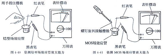 將萬(wàn)(wàn)用表置于“RX100”擋,兩表筆分別接漏極D和源極s,然后用F捏住柵極G(注入人體感應(yīng)(yīng)電壓),表針應(yīng)(yīng)向左或向右擺動(dòng)(dòng),如圖4-40所示。表針擺動(dòng)(dòng)幅度越大闡明場(chǎng)(chǎng)效應(yīng)(yīng)管的放大才能越大。假如表針不動(dòng)(dòng),闡明該管已壞。