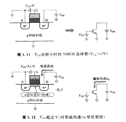 當(dāng)柵極—源極間的電壓VGS從0V逐步增加時(shí)(圖1.11),那么在一定電壓下,如圖1. 12所示,在柵氧化膜下面會(huì)構(gòu)成稱為溝道的n型化的區(qū)域,即構(gòu)成n型反型層。這個(gè)溝道就是將源區(qū)與漏區(qū)l連接起來(lái)的電子通路。這時(shí)如圖1.12所示,當(dāng)漏極加電壓VDS時(shí),漏極—源極間就有電流流過(guò),該電流叫做漏極電流。把構(gòu)成溝道所必需的柵極—源極間的電壓叫做閾值電壓VT,關(guān)于Si MOS晶體管來(lái)說(shuō),大約是0.6V。用VTN、VTP分別表示NMOS晶體管和PMOS晶體管的闞值電壓。柵極—源極間所加電壓VGS高于閾值電壓VT構(gòu)成溝道的狀態(tài)稱為強(qiáng)反型狀態(tài)(strong inversion)。