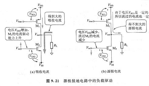 如圖9.21(a)所示,當(dāng)Vout降低,自RL流入輸出端的電流(吸收電流)增加時(shí),n溝MOS晶體管M2的柵極電壓上升。就是說,VGS2增加,M2的電流驅(qū)動(dòng)才干增強(qiáng),能夠流過大的吸收電流。